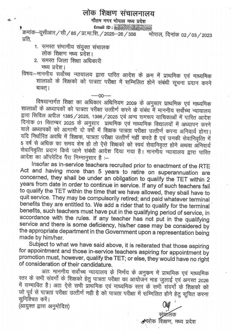MP Teacher TET News: मध्य प्रदेश के सरकारी स्कूलों में पढ़ा रहे कई शिक्षकों के मन में इन दिनों एक सवाल घूम रहा है, अगर किसी शिक्षक ने अभी तक TET पास नहीं किया है तो क्या उसकी नौकरी पर असर पड़ेगा? वजह यह है कि लोक शिक्षण संचालनालय भोपाल की तरफ से एक नया नोटिस जारी किया गया है जिसमें सुप्रीम कोर्ट के आदेश का हवाला दिया गया है। इस नोटिस में साफ कहा गया है कि प्राथमिक और माध्यमिक स्कूलों में पढ़ाने वाले शिक्षकों के लिए शिक्षक पात्रता परीक्षा यानी TET पास करना जरूरी होगा। यही कारण है कि अब शिक्षा विभाग जिलों में ऐसे शिक्षकों की जानकारी भी जुटा रहा है जिन्होंने अभी तक यह परीक्षा पास नहीं की है। आईए जानते हैं सरकार द्वारा नॉन TET शिक्षकों के लिए क्या दिशा निर्देश जारी किए गए हैं।