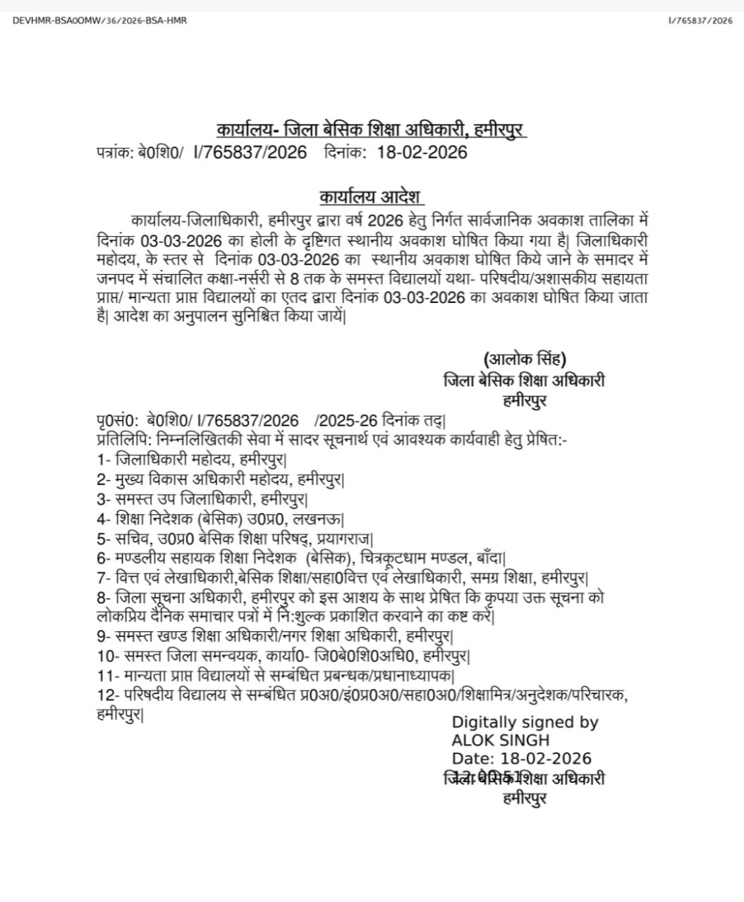 होली के बीच में पड़ रहे 3 मार्च के अवकाश को देखते हुए उत्तर प्रदेश के हमीरपुर जिले में छुट्टी घोषित की गई है। कार्यालय जिला बेसिक शिक्षा अधिकारी हमीरपुर की ओर से जारी किए गए आदेश के अनुसार सार्वजनिक अवकाश तालिका को दृष्टिगत रखते हुए 3 मार्च 2026 को होली के उपलक्ष में स्थानीय अवकाश घोषित किया गया है। जिला अधिकारी द्वारा 3 मार्च को स्थानीय अवकाश घोषित होने के बाद जिले में संचालित होने वाले कक्षा नर्सरी से आठवीं तक के सभी विद्यालय, परिषदीय, सहायता प्राप्त और मान्यता प्राप्त विद्यालयों में छुट्टी रहेगी। वहीं 4 मार्च को होली के उपलक्ष में अवकाश रहेगा। इसके बाद अब यहां 1 मार्च से 4 मार्च तक स्कूलों की छुट्टियां रहेंगी।